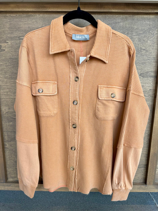 Camel Brown Garment Washed Waffle Knit Shirt Jacket