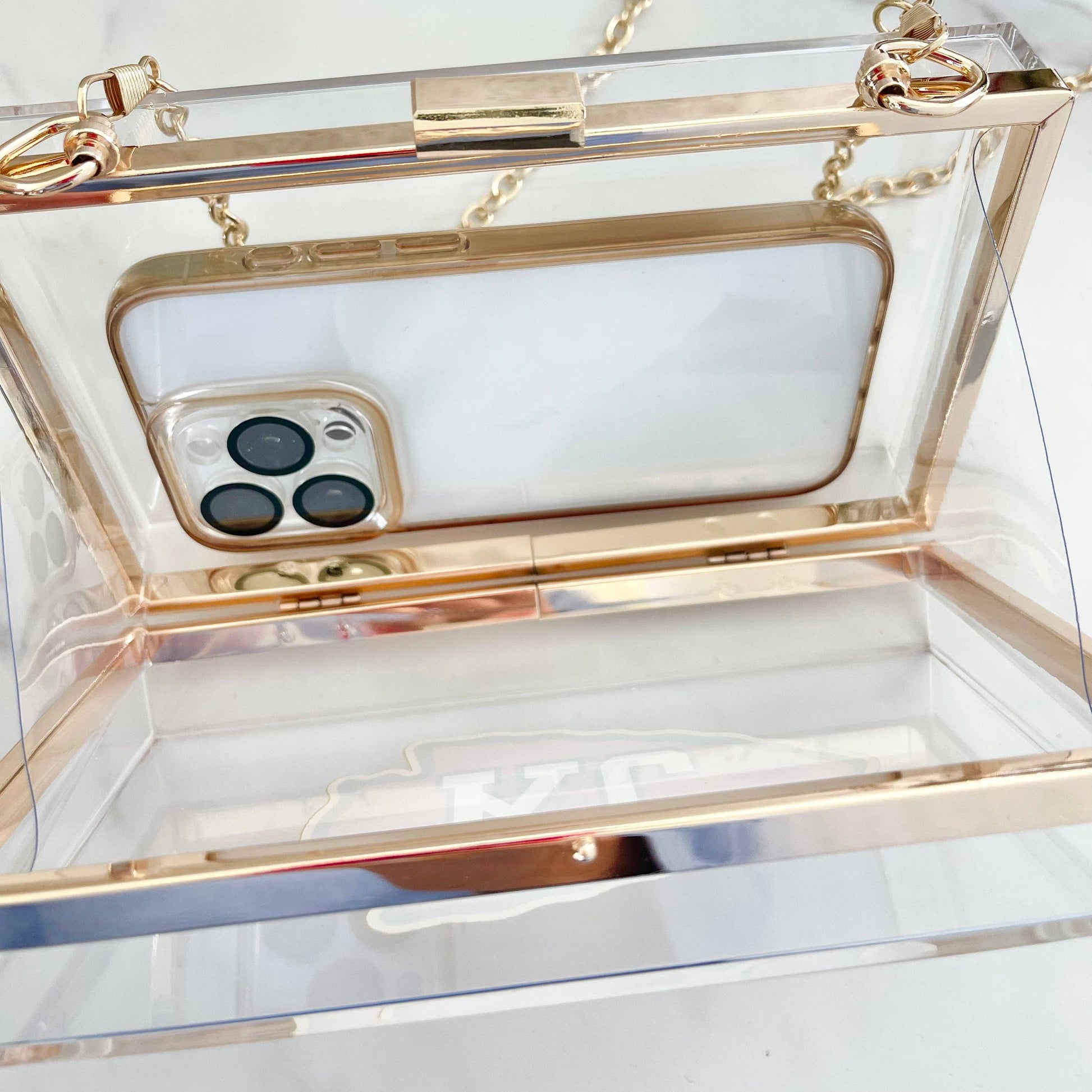 ✦ Bag measures: 7" wide x 4.3" tall x 0.75" wide Pictured with the iPhone 15 for size reference. ✦ Top clasp closure ✦ Gold chain strap included ✦ Stadium approved