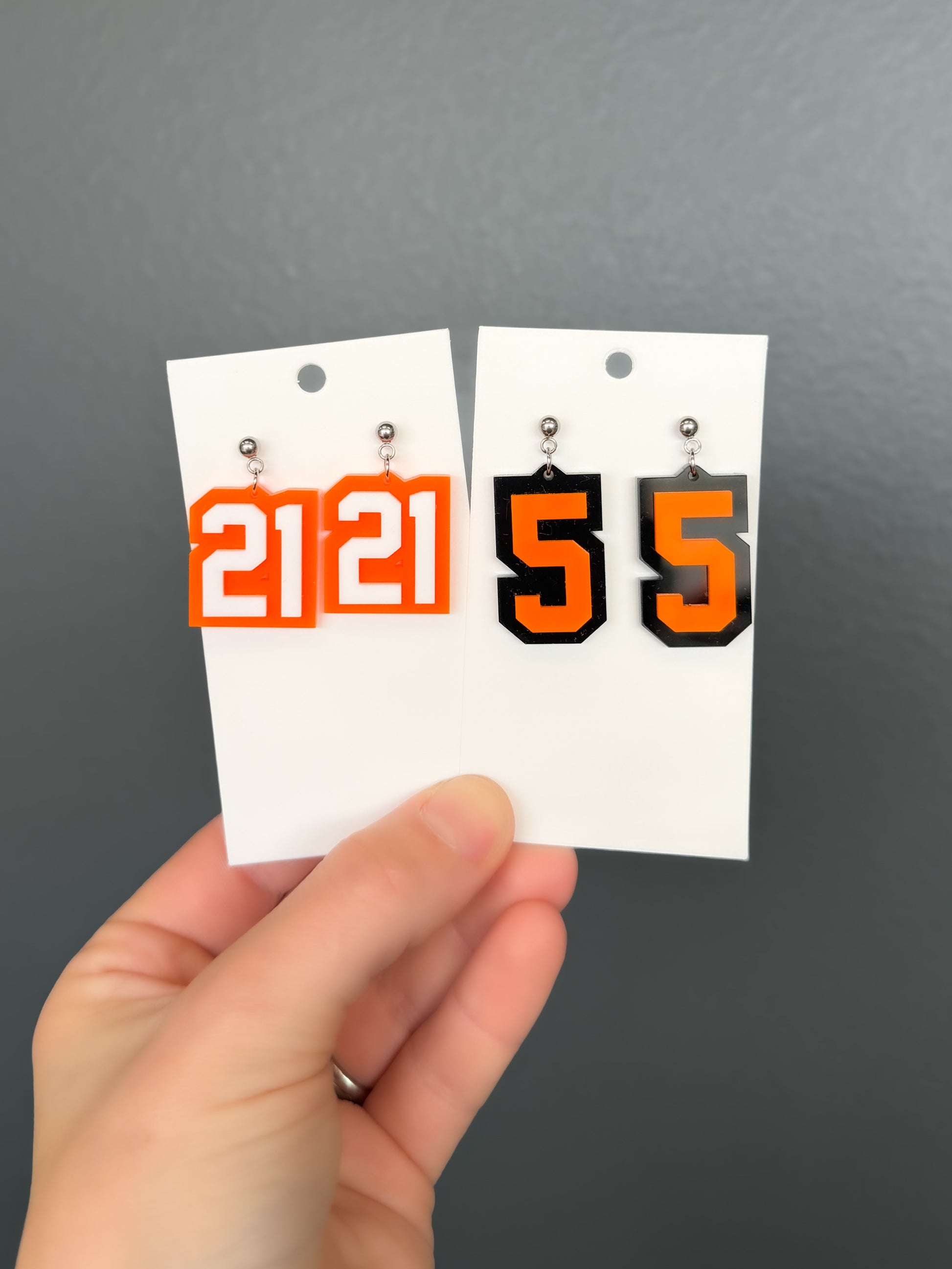 Acrylic numbers on stainless steel post back earrings. Single digit earrings will be 1 1/4" tall. Double digit earrings are 1 1/8" tall.