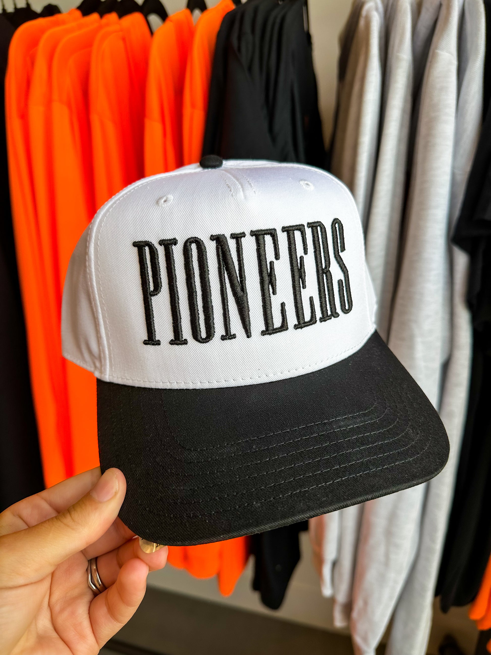 Adjustable snap back canvas trucker hat, 3D puff embroidered, white and black.