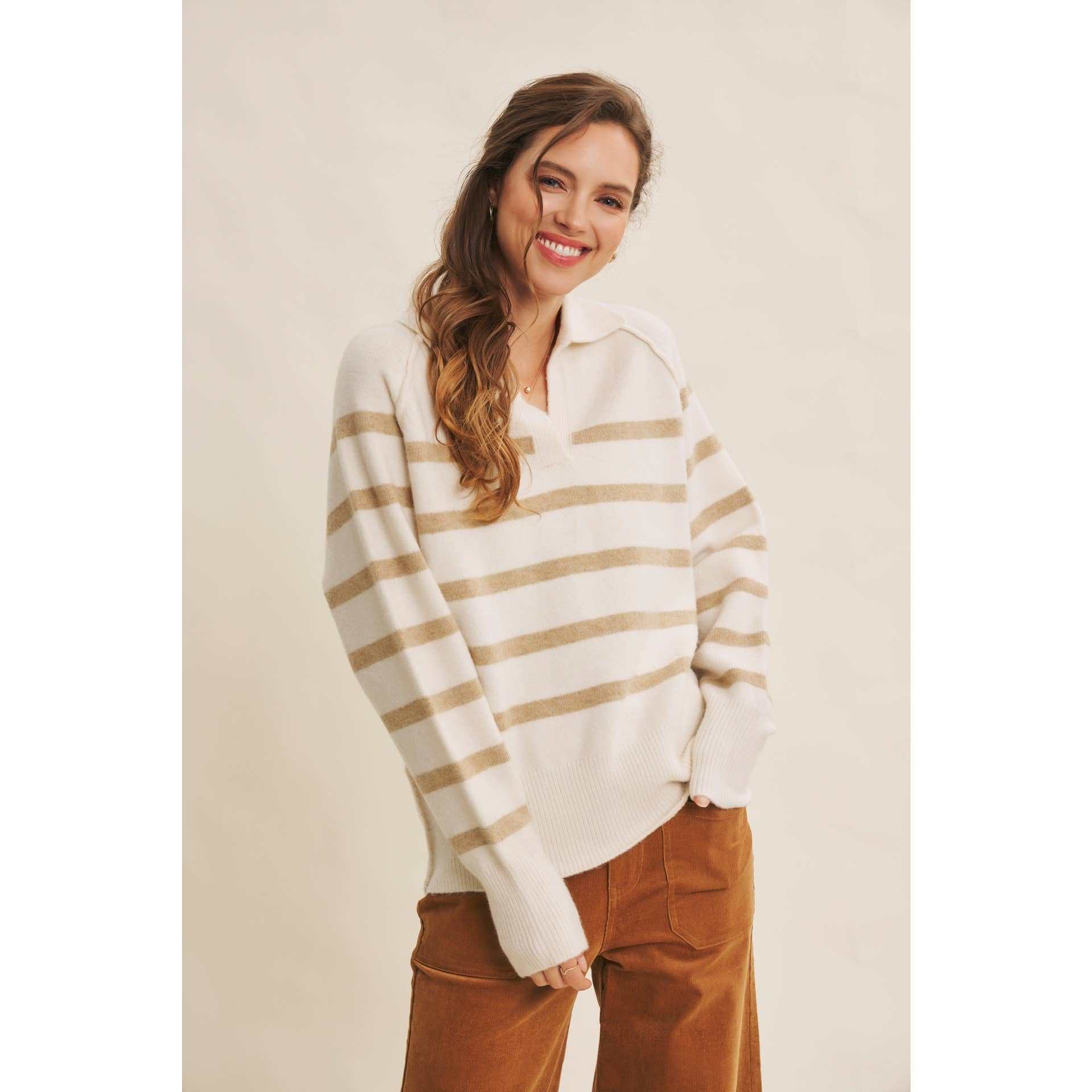Fabric includes 45% recycled polyester and 7% wool for extra softness and structure. Features - Long-sleeves - Split neck - Collared - Striped - Knit sweater Size + Fit Model is 5'9.5" and wearing a size Small.